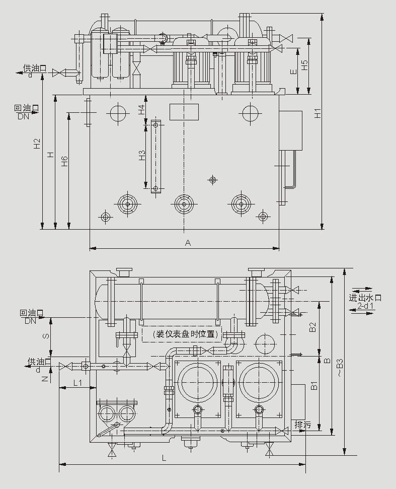 2、若稀油站采用板式冷却器,请在订货时注明,外形图及地基(≥250L/min)尺寸需作相应改变。