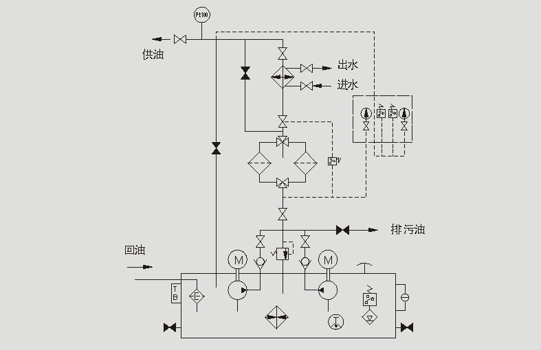 油箱装有电接点温度计,根据供油温度要求,调定最高和最低两个界限。在低温时,信号灯亮,人工开启加热器进行加热;当油温升至高点时,自动切断加热器,停止加热;且控制油温过低时,油泵不能启动;供油口装有铂热电阻,当供油口温度高时,报警并开冷却器;冷却器设有旁路直通管道,当不用冷却器或它需检修时,可关闭进出油口阀门,同时打开旁路阀门,让油经由直通管道输出或卸下冷却器进行维修,而不影响稀油站工作。