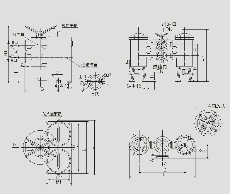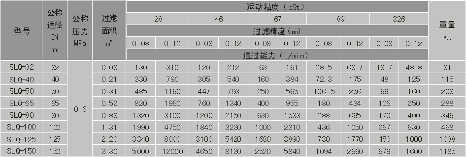 双筒网式过滤器(SLQ型,JB2302-78) 一、概述 产品适用于公称压力为0.6MPa的稀油润滑系统中,用以过滤污垢杂质,提高润滑油的清洁度,小型的为整体式,较大的为组合式,分别由二组过滤筒和一个三位六通换向阀组成,工作时一组过滤筒工作,另一组过滤筒备用,可实现不停车切换过滤筒,达到循环润滑不间断工作的目的。 二、技术参数
