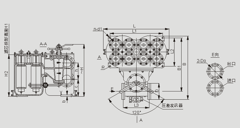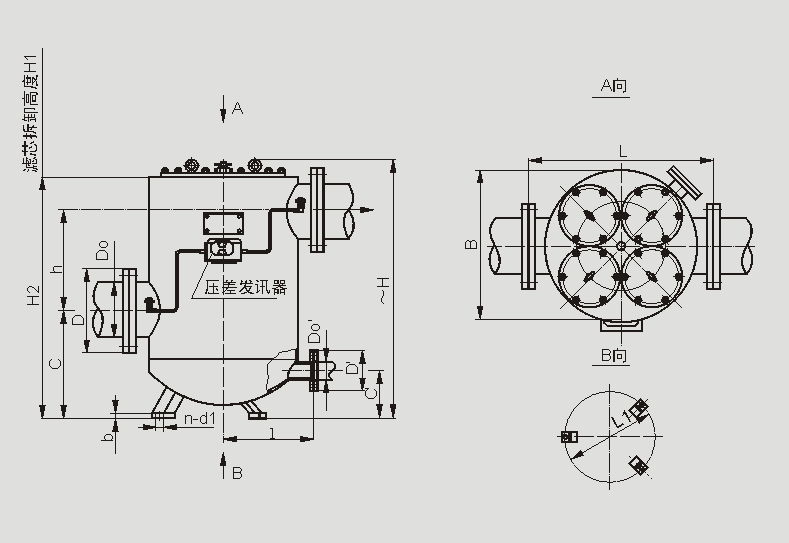 法兰标准GB573-65:DN150-3组滤芯组件、DN200-4组滤芯组件:压差发讯器为选配件。